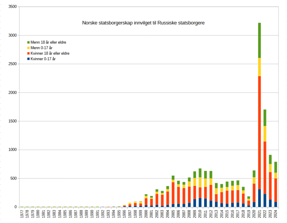 Jeg undersøkte litt og det viser seg at SSB har tall på antall statsborgerskap som er overført fra russisk til norsk. Det var en voldsom topp i 2021, året før fullskala invasjonen. Siden 2000 har fordelingen i alder og kjønn vært relativt lik: 3 ganger flere voksne kvinner enn menn, resten barn. Hhv 52%, 17% og 31%. Rent demografisk kan man tenke seg at russiske kvinner migrerer til Norge med barn, menn uten barn og at kvinner migrerer ca 3 ganger oftere enn menn. -