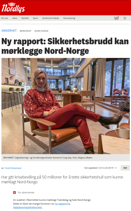 FIRE fylker kunne vært mørklagt pga et sikkerhetshull. Mon tro hvem som kan ha interesse av hybride angrep mot Norge? Artikkelen er dessverre bak betalingsmur så i stedet for å linke den, så linker jeg den ene åpne linken i artikkelen: https://www.digdir.no/informasjonssikkerhet/analyse-av-dei-enkelte-vurderingstema/5991 -
