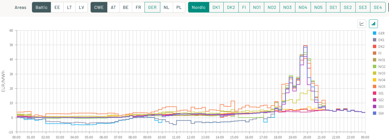 Det fortsetter sånn søndagen også. Stort sett rundt null i hele Norden og Tyskland. Bare et lite kvarter på kvelden oppe i 50 øre/kWh. -