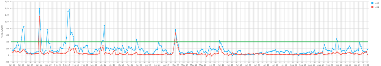 Godt poeng. Hvis vi tar spotprisen i NO3 i 2025 som utgangspunk, 17 øre, og legger på 35 øre så blir det 52 øre. Da kommer norgespris-støtten 12 øre bedre ut enn strømstøtte-støtten, forutsatt at man kombinerer det med en spotprisavtale. Men jeg ser ingen tegn til prisøkningen ennå så det er ingen vits å forhaste seg med Norgespris i NO3. Det er bare å lene seg tilbake og se det an. Til og med første dag med over 40 øre kan man fint lene seg tilbake og se det an videre, for det kan jo fort gå ned igjen også. Velger man Norgespris-støtten så binder man seg og da risikerer man å betale mer, fordi man trigget på en kortvarig topp. Se for deg at 2025 gjentar seg og du binder prisen 22. januar, den høyeste toppen her: Grønn linje er Norgespris. Blå linje er NO3. Hvis staten lurer folk inn i en binding og misbruker den til å sette opp prisen uten at det er tvingende nødvendig så vil det bli heksebrenning utenfor olje og energidepartementet. Det tror jeg de forstår også så jeg er rimelig sikker på at de ikke tør å misbruke bindingen.