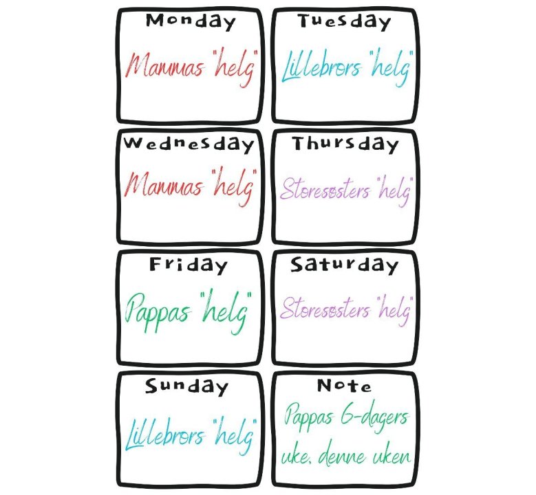 Jeg ser ikke problemet. Hva er det du ikke forstår? At 7 hverdagers uke ikke kan bety at folk har 5 eller 6 arbeidsdager? Eller at SFO og barnehage må ha 7 dager åpent, men ha skiftordning sånn at folks 2 ukentlige fridager spres utover uka? Jeg anbefaler å pusse brillene på nytt og ta ennå en kikk på den timeplanen. Prøv å forstå i stedet for å prøve å misforstå!