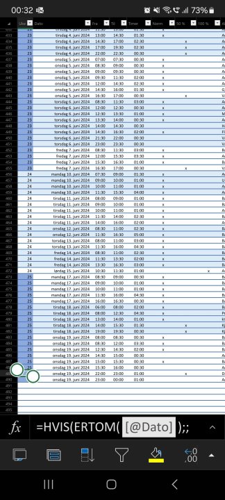 Jeg gjør slik. Fyller inn dato, start og stopp, og arket fyller ut uketallet og timer, og bruket betinget formattering for å fargelegge radene for enklere å skille dagene fra hverandre. Bruker ekstra kolonner for å markere om det er normaltid, 50% eller 100% overtid, samt en kolonne med fritekst/kommentarer. Fyller inn i dette fortløpende gjennom dagene, og kan enkelt fylle inn timelister basert på dette. (Timelistesystemet er mer kronglete og vrient å holde oppdatert gjennom dagen. Bruker excel-arket for å kunne hjelpe meg med å huske hva jeg har brukt tiden på)