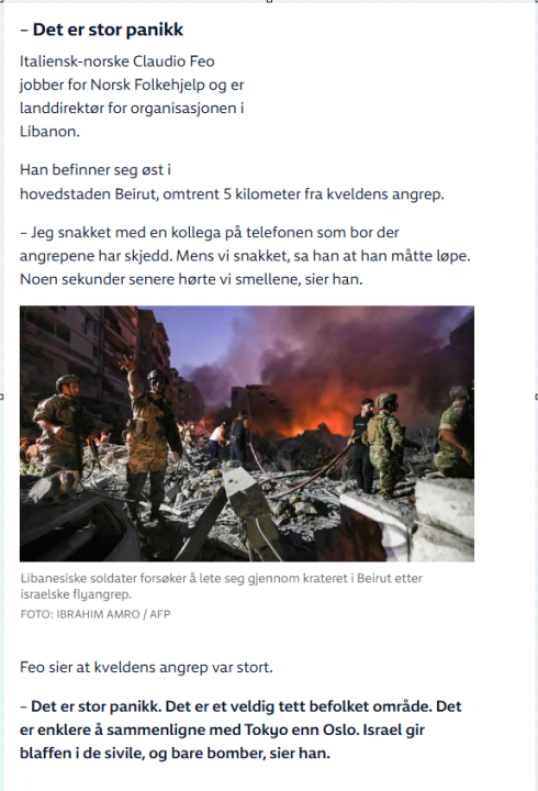 Russland gjorde som Israel når Ukraina gikk inn i kursk. De evakuerte sivilbefolkningen slik Israel evakuerte sine innbyggere når Hizbollah sendte raketter inn i Israel. Russland og Israel gjør mye av det samme mot hver sine fiender. Russland dreper helt åpenbart flere sivile i Ukraina-krigen enn hva Ukraina gjør. Og Israel sin krigføring står bak det meste av sivile tap i sin konflikt mot Hamas og Hizbollah. De største lidende partene her er sivilbefolkningen på Gaza,i Libanon og Ukraina. De som påfører lidelsene er Russland og Israel. Ut fra er humant ståsted der målet må være å stoppe de sivile lidelsene så er jeg imot Russland sin krigføring i Ukraina og Israel sin krigføring på Gaza og Libanon. Jeg støtter Ukraina sin kamp for sitt land,men jeg støtter ikke Hamas,Hizbollah eller den Israelske hæren sine kamper. Israel kjemper ikke mot noen invasjon og agererer i mange tilfeller i strid med folkeretten. Israel velger selv hvilke handlinger de gjør for å beskytte egne innbyggere og disse handlingene kjennetegnes ved bruk av ekstrem krigføring der sivile liv i hopetall går tapt og mennesker lemlestes. Det føles helt umulig å støtte et regime som går frem på denne måten mot en sivilbefolkning. Konflikten i Midtøsten er ikke en svart/hvit konflikt der man enkelt kan stille seg på en side slik som i Ukraina krigen. Så man kan faktisk være mot alle parter sin agering i denne konflikten og stille seg på de sivile sin side. Tror mange som diskuterer her inne ikke helt forstår et slikt ståsted og kun holder med en av partene og leter etter argumentasjon for å forsvare sitt ståsted og da antar at alle som argumenter imot også står på motsatt side. Så enkelt er det ikke!