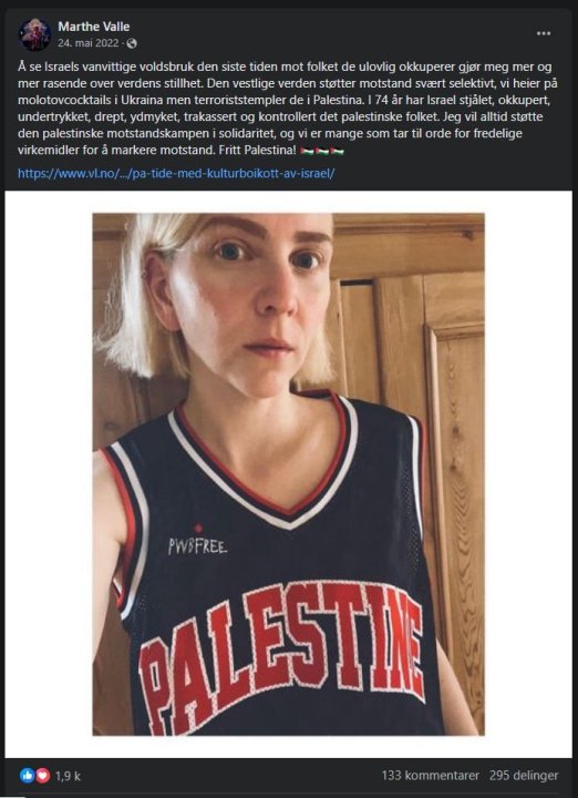 Ehm. Nei. Har ikke folk som Marthe Valle kommet på banen nå, i stadig større grad, og hevder de støtter palestinerne og deres motstandskamp mot Israel? Årsaken er åpenbart den pågående konflikten. Styresmakten på Gaza er fremdeles Hamas, og de eneste palestinerne som driver noen form for "kamp" mot Israel, og har gjort det i årevis med raketter og angrep, er nettopp Hamas. Vanlige palestinere driver da ingen "kamp", annet enn at svært mange av de støtter Hamas? Mener du vi bare misforstår Valle og andre som henne, når de skriver side opp og side ned om sin støtte til Palestina, etter det nevnte terrorangrepet? Er virkelig 7. oktober helt irrelevant for Valle, og noe vi bør glemme når vi leser hennes innlegg? Siden du nevner det, Marthe Valle skriver mye rundtomkring, men jeg kan ikke finne noen fordømmelse av Hamas?