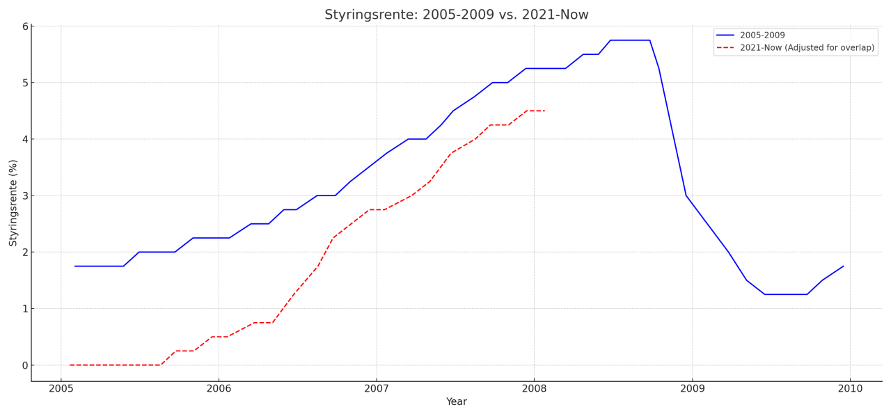 Hvis vi sammenligner med forrige tilsvarende renteutvikling ser det noe slik ut: (litt forvirrende navngiving skyldes at chatgpt ikke er veldig enkel å instruere så detaljert, men vi ser styringsrente 2005-2009 overlappet 2021 - i dag)
