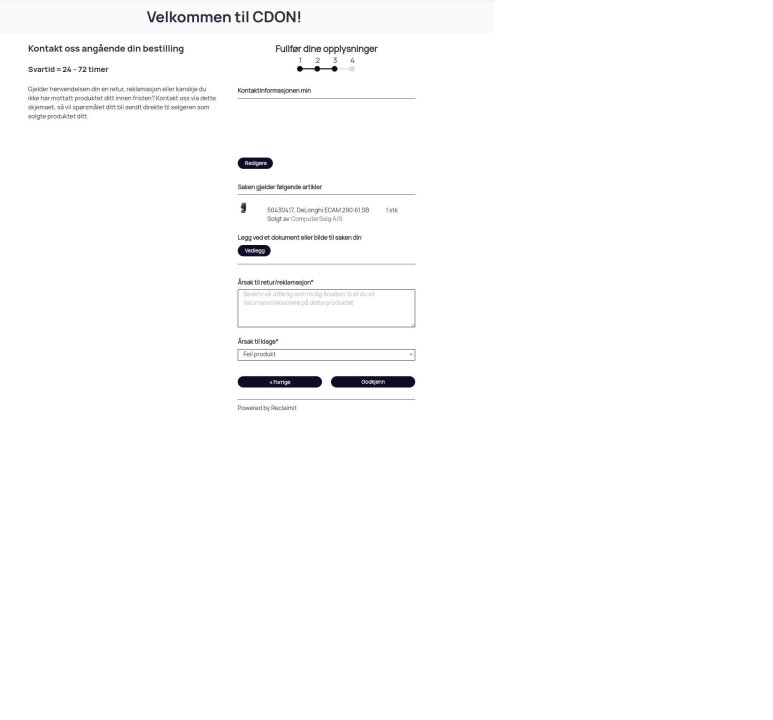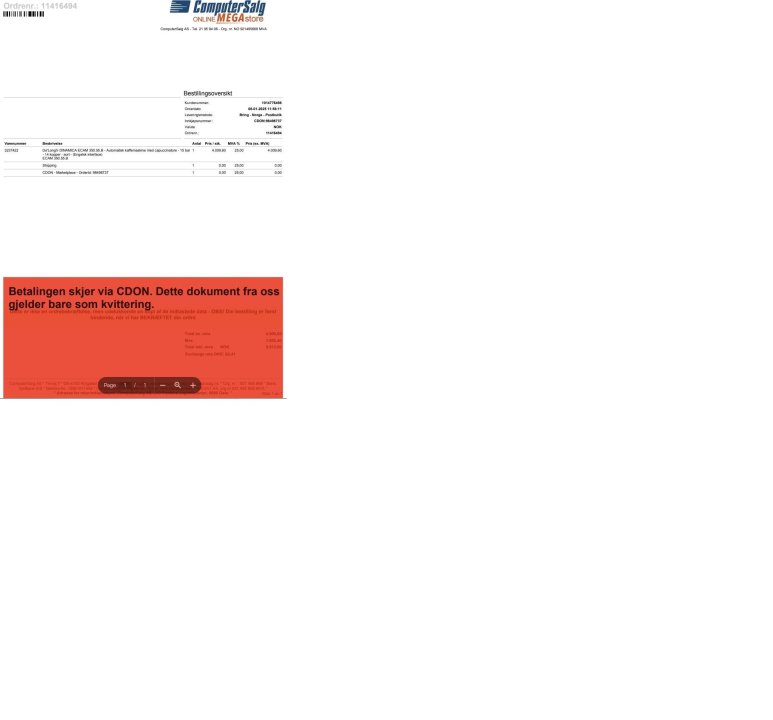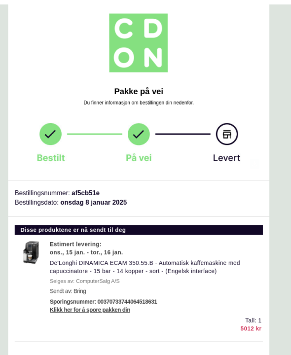 Bestilte en kaffemaskin fra cdon.no. Orderen skulle leveres fra computersalg.no. Fikk etterhvert bekreftelse og kvittering på kjøp.