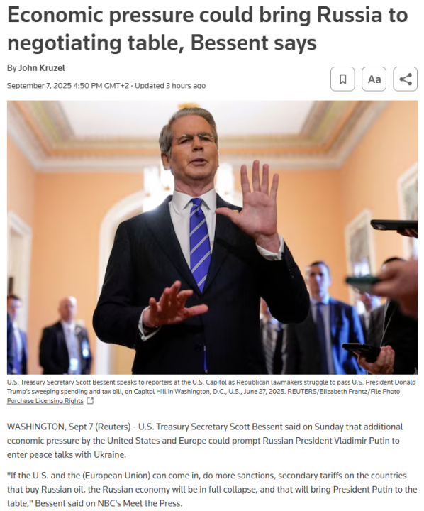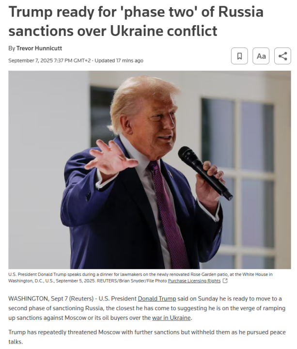 Sterkere økonomiske sanksjoner og økt militær støtte kunne tvunget frem en russisk kapitulasjon. Minus noen sekundære saksjoner (økt toll til India?) er ikke dette noe Trump har vært villig til frem til nå. https://www.yahoo.com/news/us-blocks-g7-push-tighten-134852582.html Om noe har Trump kjøpt Putin tid og vært hans lille hjelper. Sanksjoner og en lav oljepris (hvor USA trolig var involvert) bidro jo til Sovietunionens kollaps på 80-tallet.