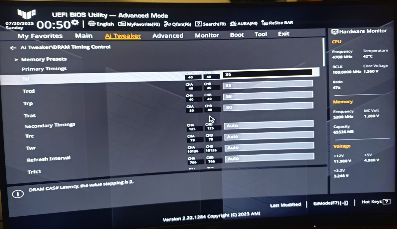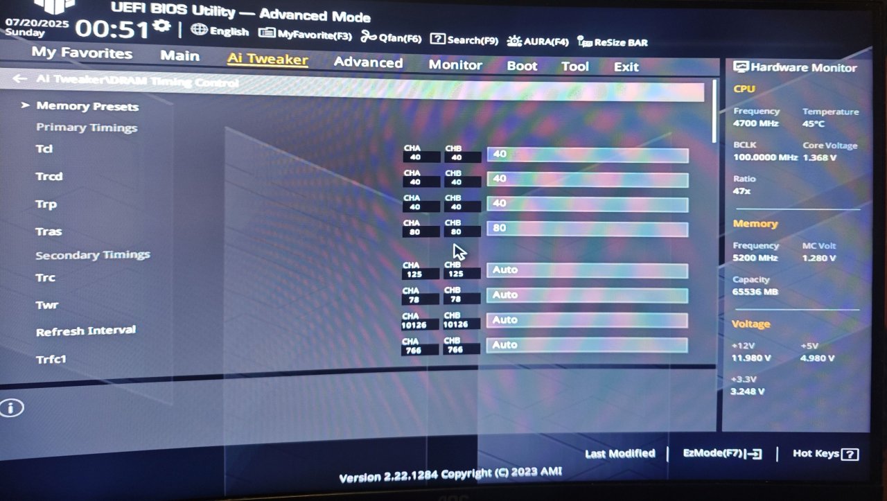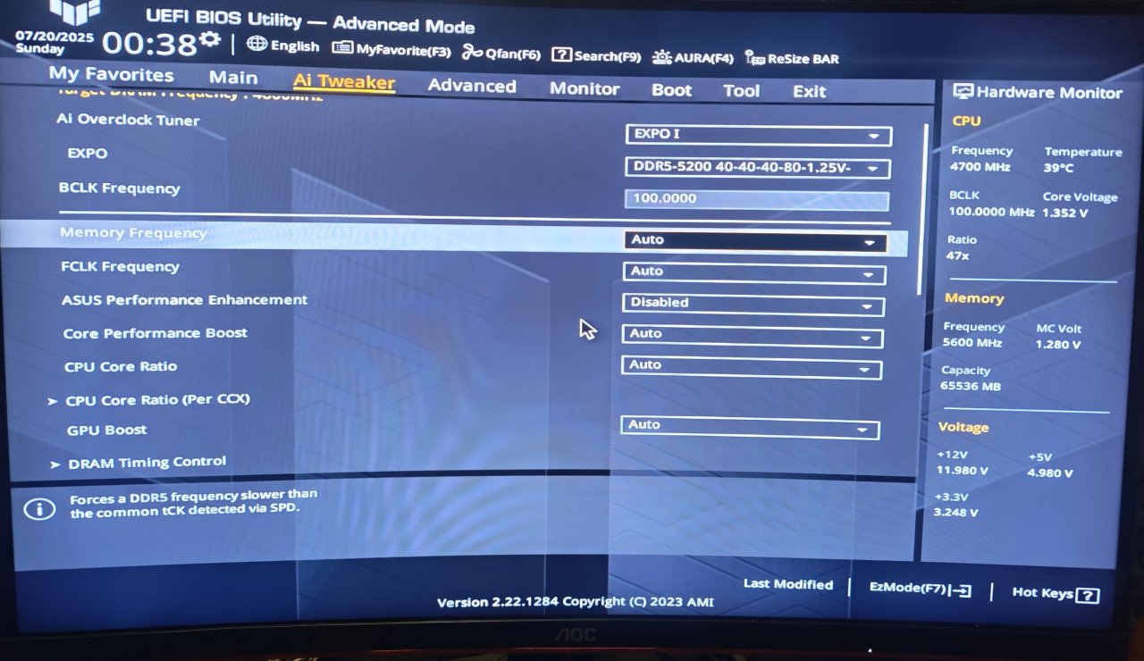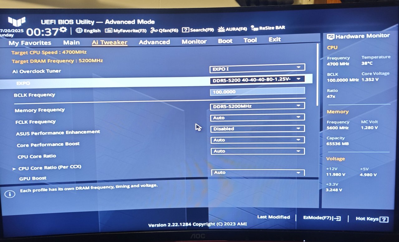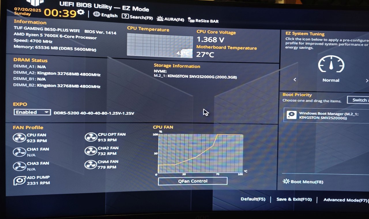Jeg kjøpte nylig oppgradert RAM (fra min 2x8gb), men etter å ha satt inn RAM-brikkene, så er PC'en veldig treig med å starte opp! I det jeg starter PC'en, så kommer ikke skjermen på med det første. Deretter ser jeg et oransje lys på hovedkortet. Etter en stund, blir lyset til rødt, før den blir til blått/hvitt og deretter grønt, og når DET skjer, så slås skjermen på og systemet startes opp som vanlig. Det går bare så ufattelig treigt før jeg kommer til det punktet.... Jeg har en PC med følgende specs: Hovedkort: ASUS TUF B650 Gaming PLUS WiFi CPU: AMD Ryzen 5 7600X RAM: Kingston Fury Beast 16GB DDR5 GPU: AMD Radeon RX 6700 XT 12 GB Lagring: WD Blue SN570 NVMe 1TB PSU: Cooler Master 650w GOLD Kjøler: CM ML240 Kabinett: Phanteks XT Pro OS: Windows 11 Jeg har vedlagt noen BIOS-bilder av PC'en, i håp om at det hjelper. Er det noe jeg kan gjøre for at PC'en skal kunne startes raskt igjen? Det var jo meningen at PC'en skulle bli RASKERE, ikke TREIG.... Jeg har prøvd å bytte slots på brikkene, men det hjalp ikke. Jeg har prøvd å kjøre kun 1 brikke, det hjalp heller ikke. Jeg ser for øvrig at jeg har 64GB minne når jeg kommer meg inn i Windows... Dette er for øvrig RAM-brikkene jeg kjøpte: https://www.proshop.no/RAM/Kingston-FURY-Beast-DDR5-5600-64GB-CL36-Dual-Channel-2-pcs-AMD-EXPO-Intel-XMP-Svart/3136894 Det eneste jeg ikke har prøvd, er å oppdatere BIOS... Vil det løse problemene, kanskje? Håper noen her vet hvordan jeg løser dette!