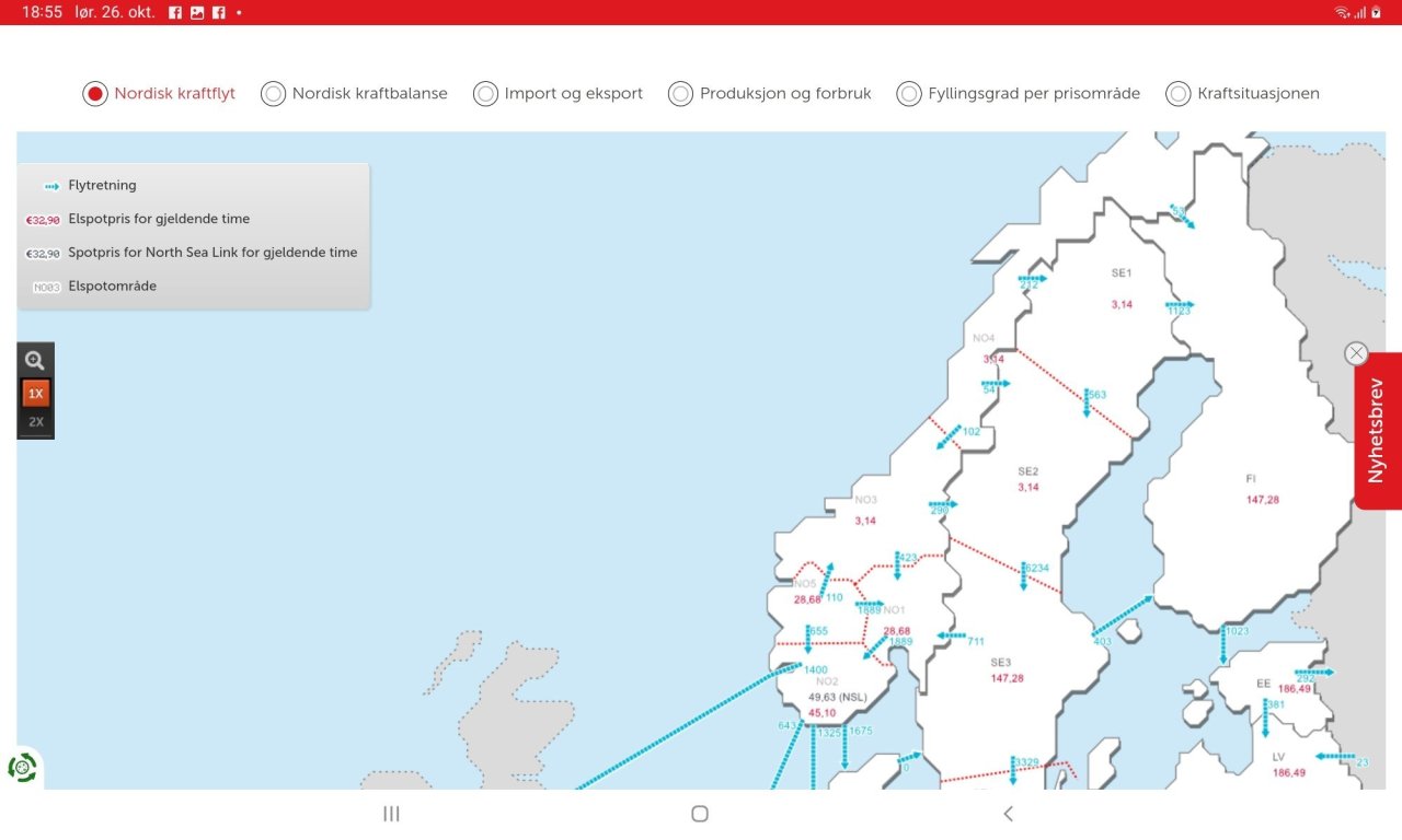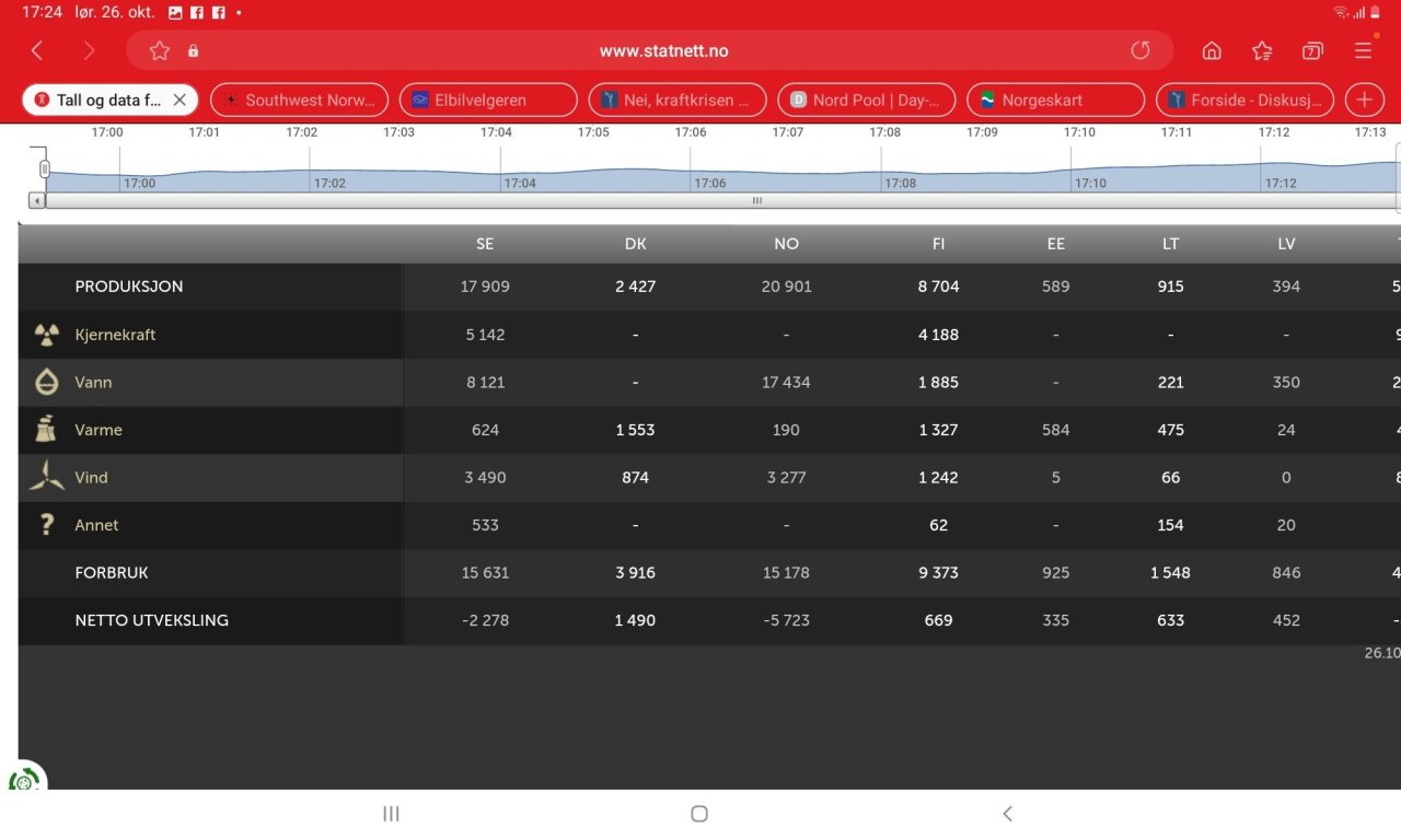 18. Akkurat no vil eg sei vi ikkje har kraftkrise. Fyllingsgraden nær median og billig straum i midt og nord Norge pga masse vind I Sverige. Så hjelper det jo på at eksportkabelen til England har vore ute av drift sidan 13 oktober, noken som veit kva som skjer der? Men når det blir kaldt kjem vi vel fort tilbake til tørrår, lav magasinfylling og høgt forbruk.