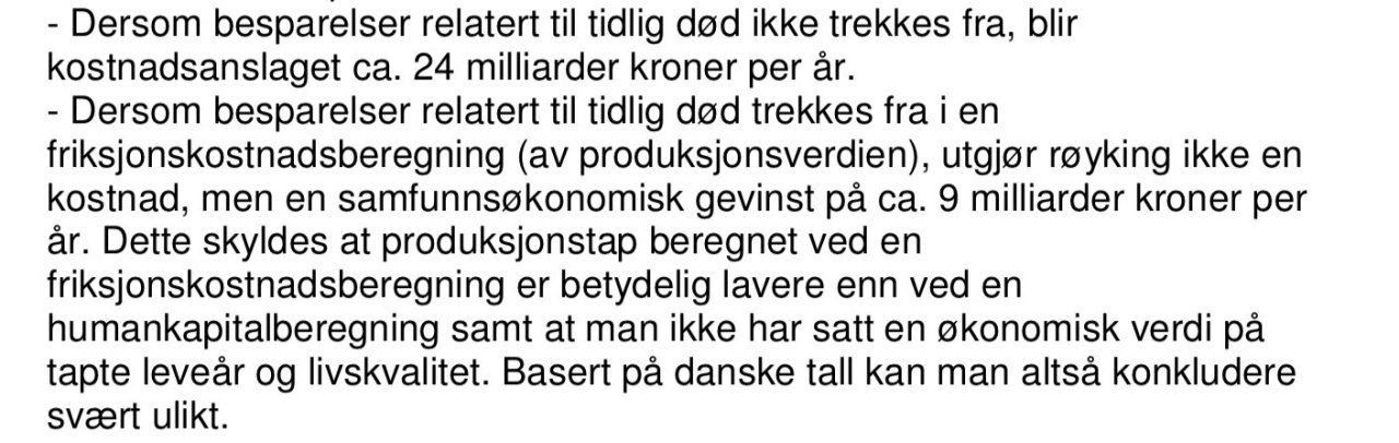 Røykere er «lønnsomt» for samfunnet i forhold til ikke-røykere. Høyere kostnader til kreftbehandling mer en spares inn ved at pensjonskostnadene blir lavere pga tidlig død.