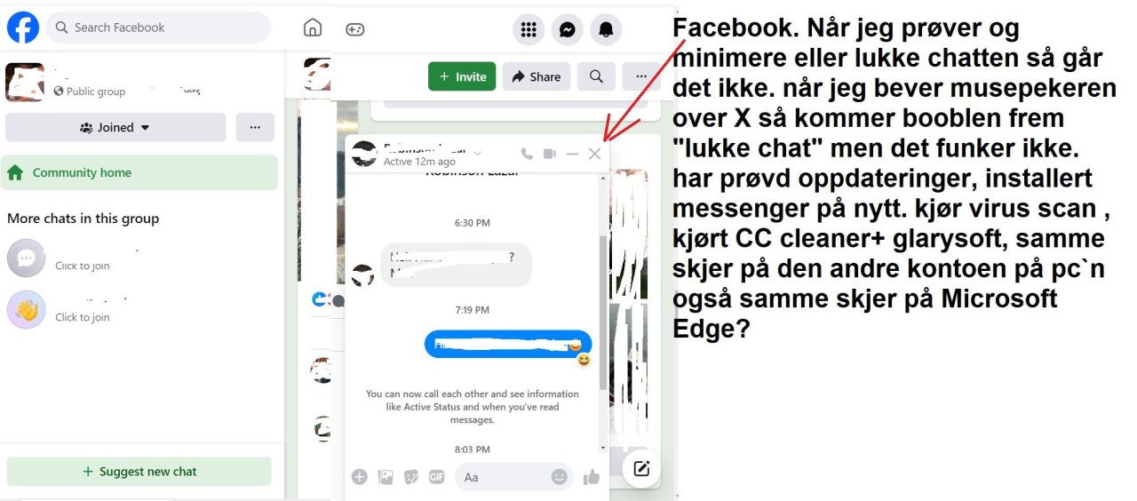 Facebook. Når jeg prøver og minimere eller lukke chatten så går det ikke. når jeg bever musepekeren over X så kommer booblen frem "lukke chat" men det funker ikke. har prøvd oppdateringer, installert messenger på nytt. kjør virus scan , kjørt CC cleaner+ glarysoft, samme skjer på den andre kontoen på pc`n også samme skjer på Microsoft Edge? Den var helt ok igår