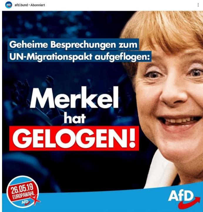 1. Det står ikke "Muslimfreie Schulen!". Stråmann. 2. "Leitkultur" er et tysk konsept som betyr "veiledende kultur" eller "feller kultur". Altså et stikk til Islam og multikultur. Å oppløfte tysk kultur er selvfølgelig helt innenfor.🙂 1. "Nye BKA-tall (Tysk federalt politi) avslører en skremmende realitet. Vold mot oss fra migranter øker! Umiddelbart deporter kriminelle asylsøkere!" Også helt innenfor. 🙂Støttes også i Norge. 1. "AfD-undersøkelse avslører: 686 000 illegale innvandrere lever på vår bekostning!" Fysj å fy, tenk å sette søkelys på sånne tall! Tenk heller på alle den gode kebaben!😂 Helt innenfor å drive folkeopplysning i valgkamp.🙂 Sånn som all politisk propaganda?🙂 1. Beklager. egenkomponerte og beskjærte bilder fra et privat blogginnlegg og analyse av en journalist for en migrant-vennlig venstreavis for å bekrefte eget syn på at AfD = Nazi er jo bare latterlig. 😂 Er dette rælet du leser? Snakk om å gripe etter halmstrå. Originalbilde: Tekst: "Hemmelige møter om FNs migrasjonspakt avslørt: Merkel løy!" Ingen tvil om at Merkel førte det tyske folk bak lyset vedrørende migrasjonsavtalen. Die Linke, SPD, CDU osv. bruker alle mindre sjarmerende bilder av sine motkandidater i sin propaganda på sosiale medier. Det er ikke spesielt med AfD.