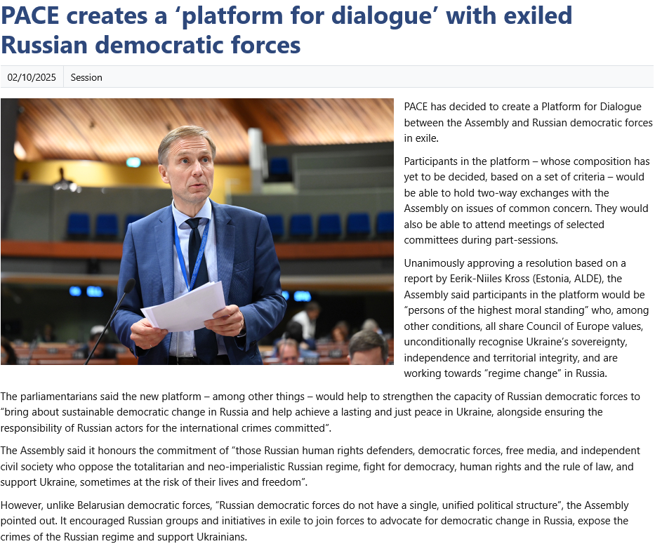 Hvem er disse Russian Democratic Forces folka? - Mikhail Khodorkovsky / Russian Action Committee and Russian Anti-War Committe - Garry Kasparov / Free Russia Forum - Natalia Arno, Vladimir Kara-Murza / Free Russia Foundation Og den mest åpenbare kandidaten, den som faktisk representerer russere? - Alexei Navalny / Anti-Corruption Foundation .. as of now they do not qualify as Russian Democratic Forces as defined by the Assembly. -
