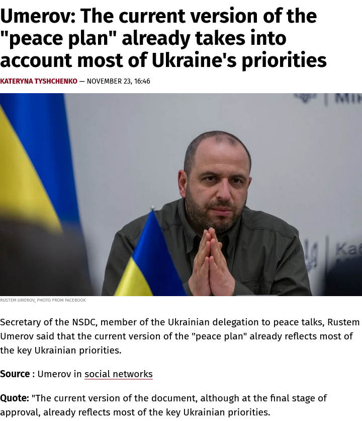 Nå er vel Umervo neppe en spesielt troverdig kilde selv heller.. Og ville vært rart om han hadde gått ut å innrømmet at han har kommet med innsill dersom han ikke hadde noe offisielt mandat til dette. Dog har denne påstanden gått over flere dager, antagligvis er det flere kilder innvolvert - ikke bare en enslig kilde. Og Umerov selv virker jo også å være ganske godt fornøyd med innholdet i den (foreløpige) planen. -