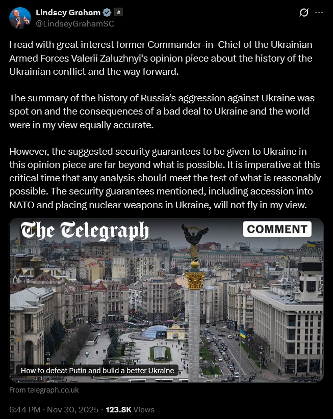 Graham til Zaluzhnyi's "Ukraine’s accession to Nato, the deployment of nuclear weapons on Ukrainian territory or the deployment of a large allied military contingent capable of confronting Russia.": -