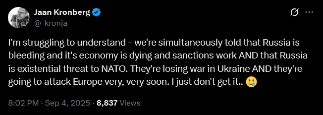 21. En "proporsjonal" reaksjon (som jeg i andre tråder har lært er sykt viktig) vil vel være å sende 16-17 droner fra europeisk land inn mot Russland, i retning av St. Peterburg og Moskva.