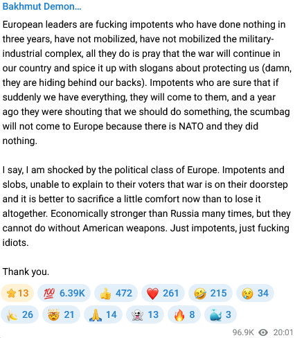 En hilsen til alle europeiske impotente ledere som "pray that the war continues" fra en frontblogger i Pokrovsk regionen. Ikke noe beskytter de bedre enn å rope slogans. -