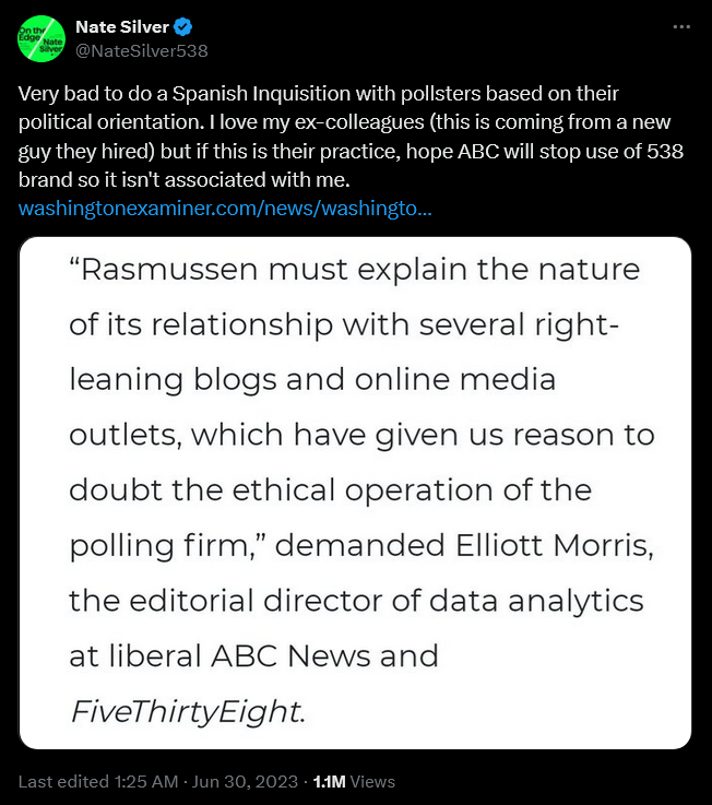 Det er forskjell på klare og vil. Hvorfor skulle ikke Rasmussen "klare" å svare på disse spørsmålene? Hva synes du om spørsmålene? For eksempel det første, "[Arizona] since the outcome of the poll does not match the observable election result" - basert på det alene er det vel gaanske mange som burde vært kastet ut? Hva med ABC selv som hadde Biden +12 i sin siste poll i 2020. I den grad 538 burde kaste ut noen er det på grunnlag av hvor dårlige de er, ikke på grunnlag av at folk ikke vil snakke med de. Det er ikke første gang 538 har kastet ut noen av bransjens beste. Det eneste fører til er at gjennomsnittsmålingene blir mer upresis..