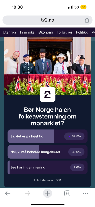 Er en spørreundersøkelse på tv2.no nå, 58.5% er for og ha avstemming om vi skal ha monarki i Norge