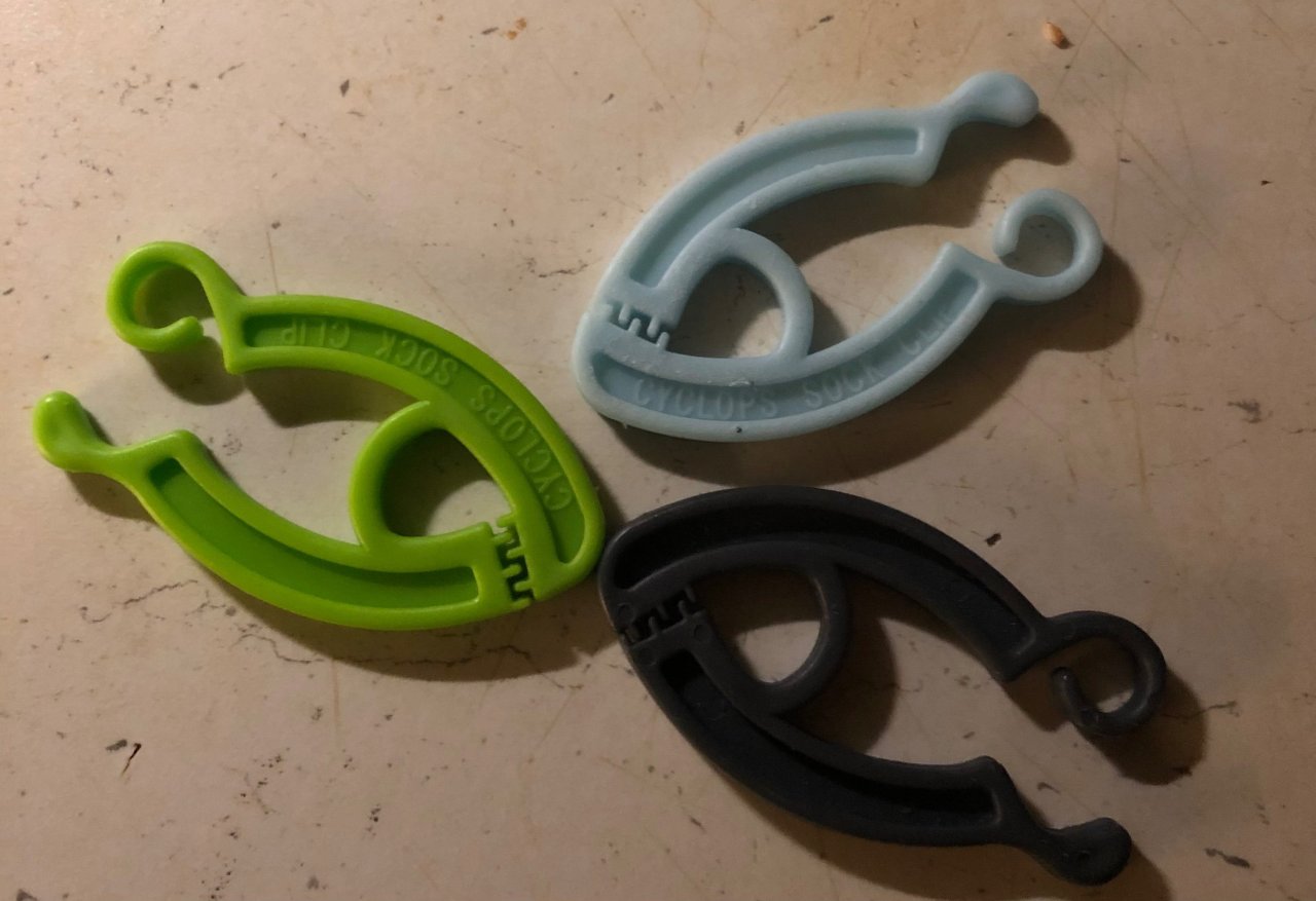 3 sokkeklyper. Jeg brettet nettopp noen klær jeg hadde vasket og tørket. Hvis jeg legger sokkene løse i vaskemaskinen, så mister jeg alltid en.