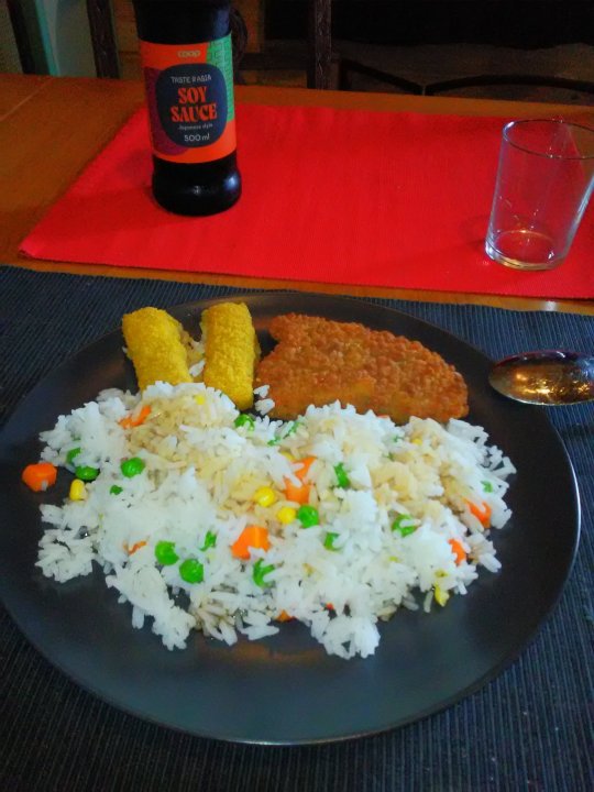 Sen middag i dag. Pyttipanne, med mandelpotet, komle, spagettiskruer, basmatiris, loek, hvitloek, egg og ultra prosessert ostesnitzel av merke Coop.