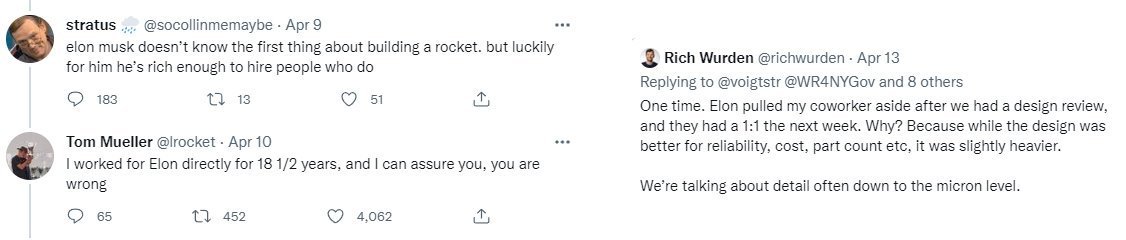 Han var representativ for de fleste "eksperter". Det kan godt være, men jeg snakker om hva han har oppnådd tidligere. Hvorfor er det bare under Musks ledelse at det skjer utrolige ting gang på gang? Han gjør ting ekspertene påstår er umulig, og han gjør selskapene sine dominante innenfor sine respektive markeder. Han er ikke bare flink til å finne folk, men deltar aktivt i forskning og utvikling. Hva er størrelsen på selskapet du jobber i? Er det verdensdominant? Har sjefen din ledet flere selskaper til verdensdominans? Som sagt, Elon Musk har deltatt aktivt i forskning og utvikling. Jeg vet ikke hvordan det er i dag, men det var slik tidligere. Det er ikke uten grunn at selskapene hans oppnår "det umulige". -