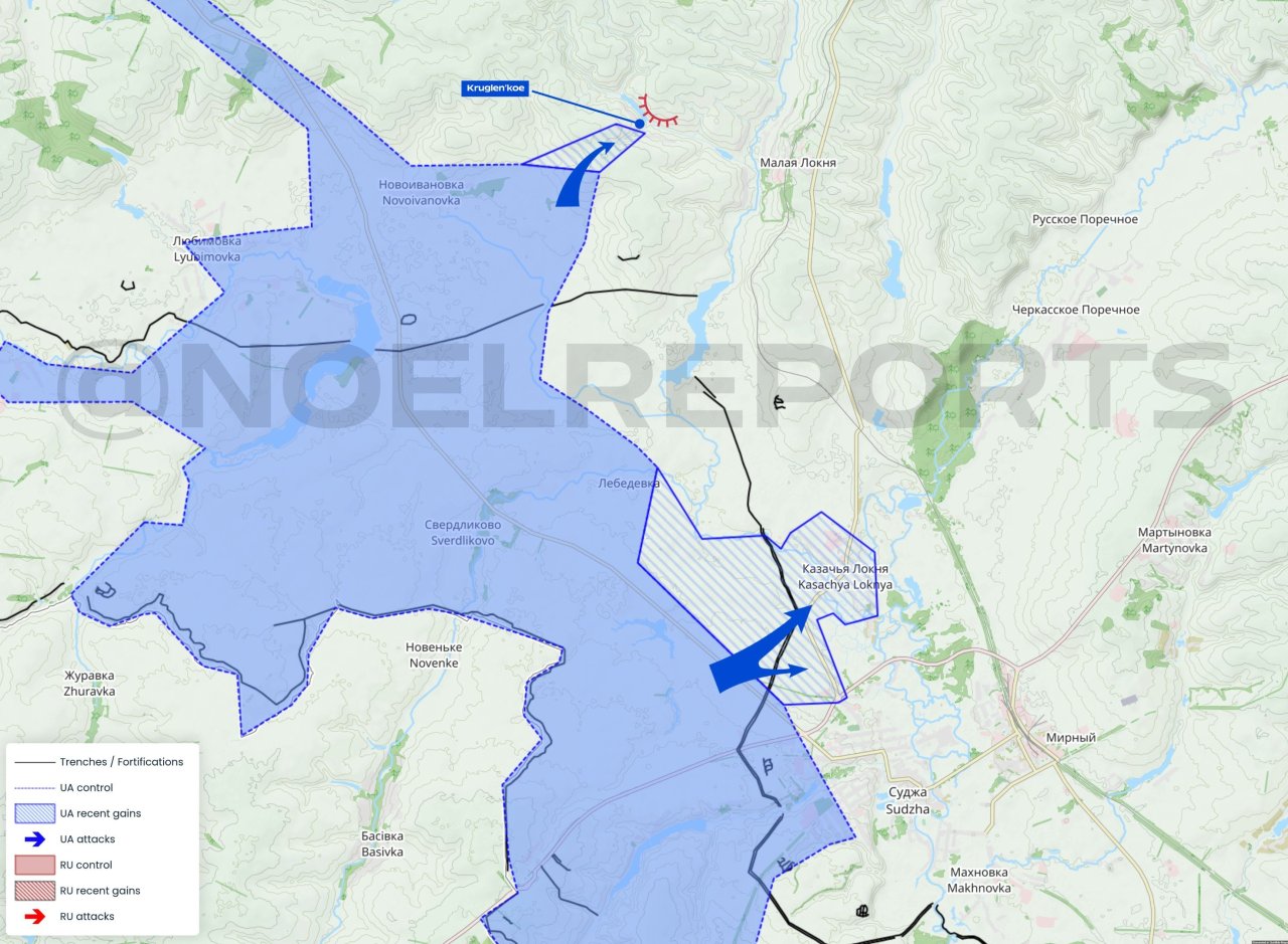 Sudzha er tatt. Korenevo er sansyneligvis også tatt. Ifølge russerne dundrer ukrainerne mot Rylsk og litt saktere mot Lgov. De ser ikke ut til å avansere langs veien mot Kursk (rød strek), som er den raskeste og mest direkte veien. Der blir det også brukt glidebomber sluppet fra russiske fly i desperasjon etter å stanse ukrainerne. Atomkraftverket er i lilla firkant. Der vil ikke Russland kunne bruke luftstyrker. Ukraina ser altså ut til å mene alvor, men har forsiktig fremferd så langt, til tross for relativt små russiske styrker. Det er ikke en fordel å rase forbi forsyningslinjene og forsterkningene sine. Har Ukraina tenkt å omringe Kursk? Det vil bli et drama uten like i krigen så langt for vanlige russere som Putin aldri i verden vil kunne legge skjul på selv om han stenger hele internett.