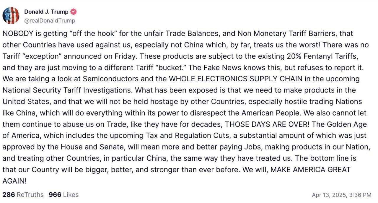 Trump sier nå at meldingen om unntaket for smarttelefoner og datamaskiner er 'Fake News'. Tekprodukter er flyttet over til 'Fentanyl-tollen' på 20 %. (Kilde: DJT på Truth Socia)