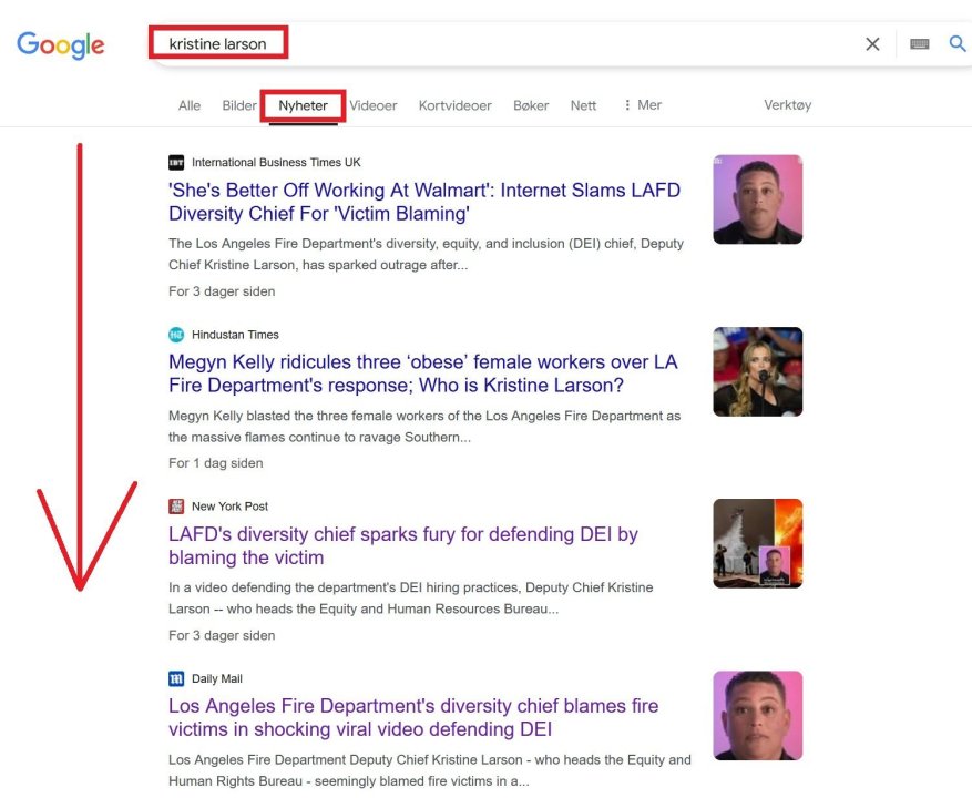 Du skjønner jo ikke at dette henspiller på uttalelsen til Kristine Larson: In the public relations video that re-emerged from 2019, Deputy Chief Kristine Larson - who heads the Equity and Human Rights Bureau - defended the fire department's use of DEI hiring practices. She then addressed concerns that female firefighters may not be strong enough to carry a man out of a burning building, to which she simply responded: 'He got himself in the wrong place if I have to carry him out of a fire.' Kilder: https://www.skynews.com.au/world-news/united-states/la-fire-depts-487000peryear-diversity-chief-sparks-fury-for-defending-dei-by-blaming-victim-he-got-himself-in-the-wrong-place/news-story/3c2a113d7af8347c6ed126159c243ac2 https://www.dailymail.co.uk/news/article-14276655/Los-Angeles-Fire-Department-Kristine-Larson-diversity-fire-victims.html Hun mener altså at hvis kvinner ansatt i brannvesenet er for svake til å bære ut ofre for LA-brannene, kan de ha det så godt. Ganske bisarr uttalelse. Eller skal vi si... woke uttalelse? -
