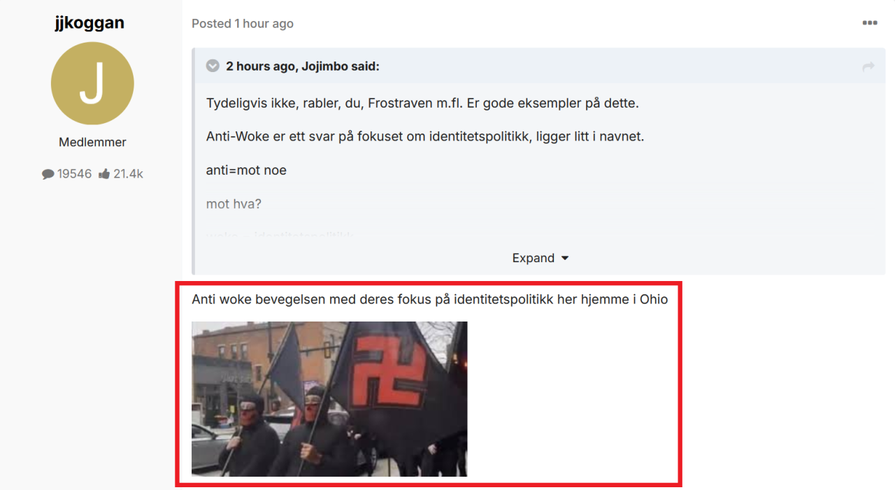 21. Jeg har ikke adoptert noe som helst. Som nevnt før i tråden, har jeg vært motstander av påtvunget "mangfold", krampeaktig tokensime og utstudert injeksjon av "minoriteter" leeeenge før jeg hadde hørt begrepet woke. At dét jeg har vært imot lenge nå har fått et praktisk anvendbart begrep, forandrer ikke på dette.