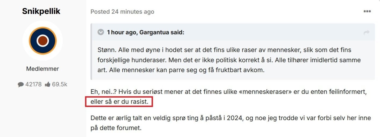 Som jeg trodde. Du klarte ikke å formulere en tanke selv. Bare copy/paste fra resyméet. Ganske forutsigbart. Dette med rase og spesielt menneskerase er bare semantikk. Folk klikker i vinkel bare de hører ordet "rase". Men rase er bare en folkelig taksonomi vi bruker som snarvei, i stedet for å si "etnisitet", "populasjon", "geografisk tilhørende i land x". Hvorfor er det så farlig å erkjenne at en fra Tsjad ser annerledes ut enn en fra Island? Du kan ikke vinne VM i 100 meter hvis du er hvit. Sorry, det går ikke. Genetikken må være i bunn. Du må være svart. Svart og hvit her er i betydningen rase. -
