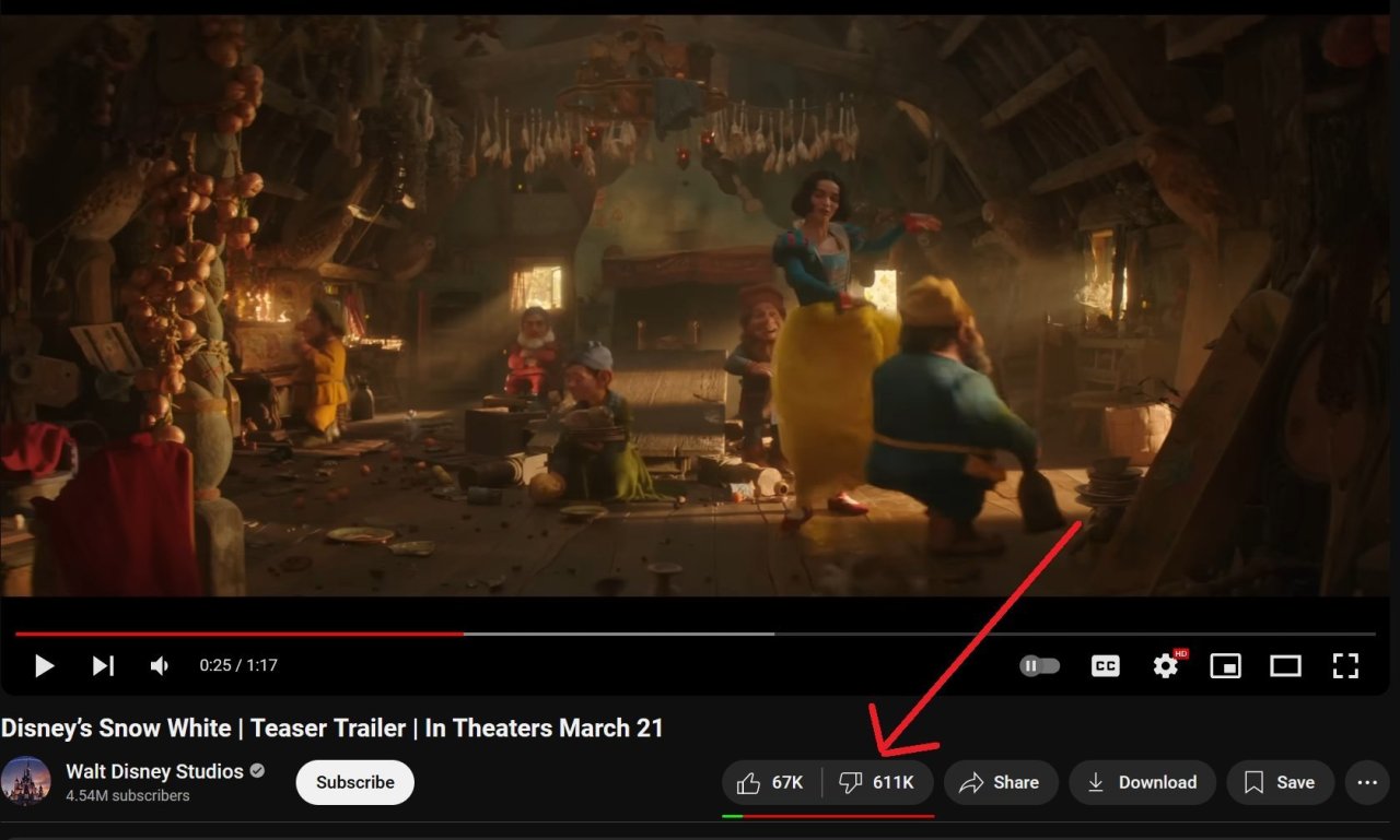 Snow White kommer i 2025. Traileren har snart 90% dislikes på YouTube. Dvergene er erstattet med CGI, fordi ekte, kortvokste mennesker ville være "offensive" (støtende). Peter Dinklage sa: You’re progressive in one way [fordi Snøhvit spilles av en latina] but you’re still making that fucking backward story of seven dwarves living in the cave. What the fuck are you doing, man? Have I done nothing to advance the cause from my soapbox? I guess I’m not loud enough. Nå ser alle ut til å hate traileren, både woke-folk og anti-woke folk. Hva er det Disney driver med? -