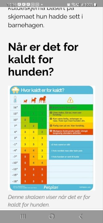 Steder i landet skal det bikke - 25. Katter og mindre hunder er spesielt utsatt. Skal ikke forklare hvorfor, tenk heller etter og les deg opp.. Da blir det faktisk klær og evt.labbe-sokker som gjelder. Hvis du som hundeeier synes det bare er flaut og ser dumt ut, så vennligst ofre en tanke til dyret istedenfor. Det anbefales til tross for klær at hunder bør få en vesentlig mindre luftetur enn vanlig. Råd fra min veterinær. Håper jeg slipper å se altfor mye egoisme og tankeløshet i denne perioden vi møter..! 🥶❤️🙂