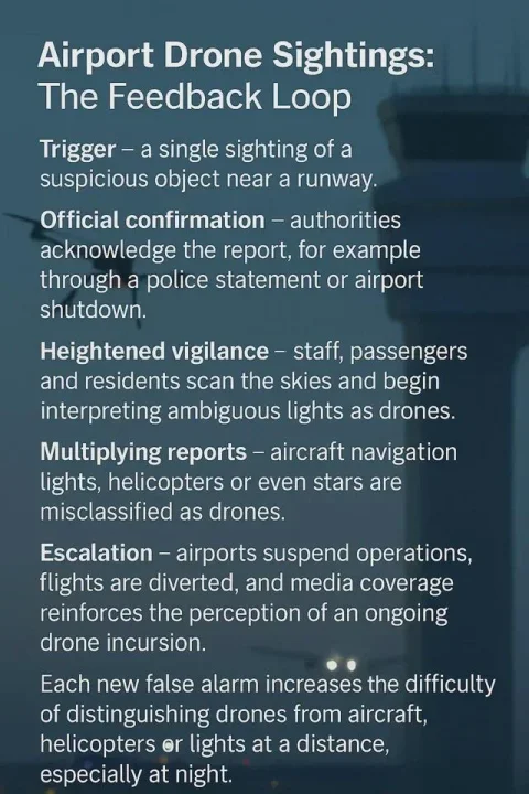 Fantasi står bak. Folk ser et fly, helikopter, stjerne, planet. Så ringer de politiet. Luftrommet blir stengt. https://www.dr.dk/nyheder/indland/droner-set-over-koebenhavns-lufthavn?focusId=10236345 -