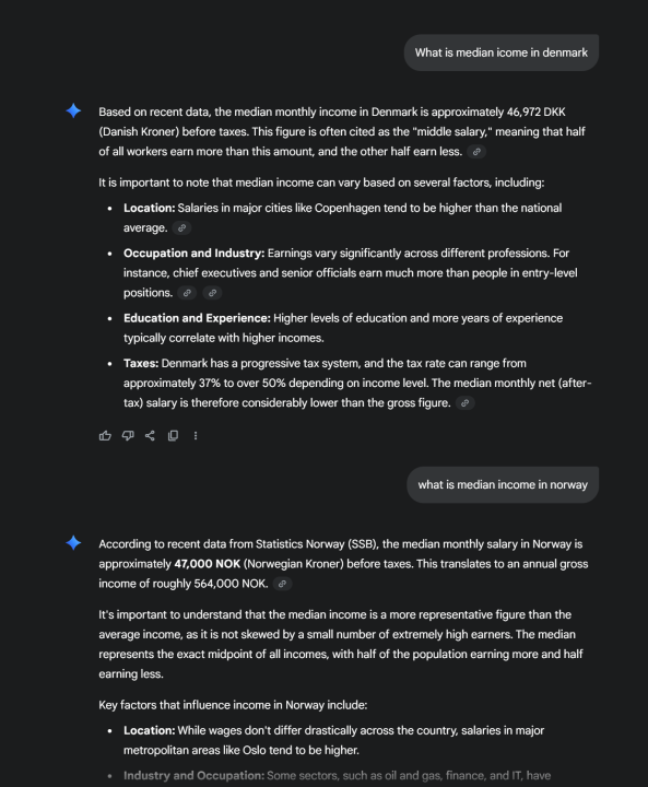 Man kan trygt se at den økonomiske utviklingen i norge har gått så til de grader til helvete, at median inntekten danmark er så mye høyere gjenspeiler også at forskjellen er mindre i danmark.