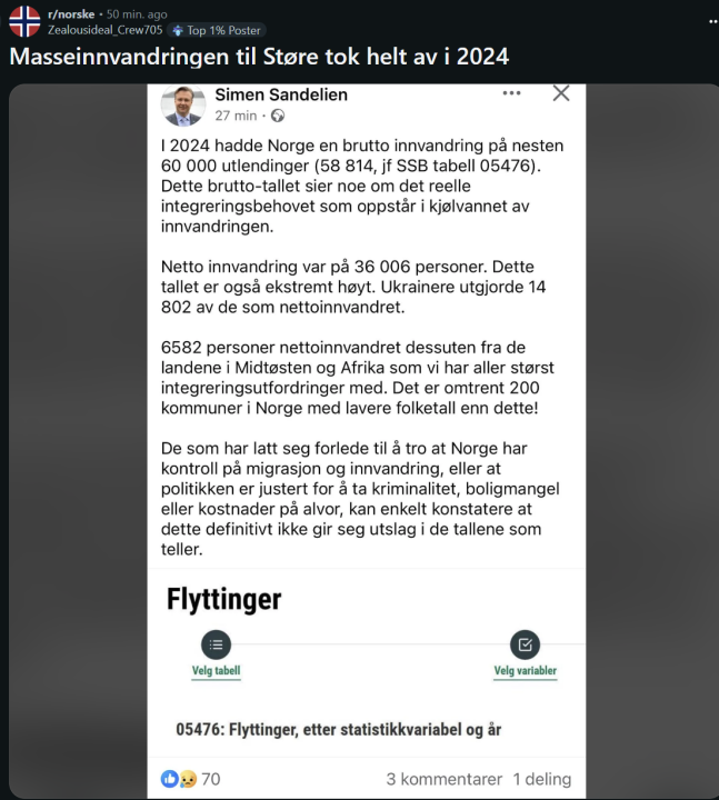 https://www.ssb.no/befolkning/folketall/statistikk/befolkning Fødselsoverskudd 9700. Noe som også inkludere innvandrere, de føder også flere barn enn nordmenn. Nettoinnvandring 66 000, ja jeg bruker netto da de som flytter ut kan likeså godt være nordmenn. Og folk påstår at den store befolkningsskifteter en konspirasjonsteori -