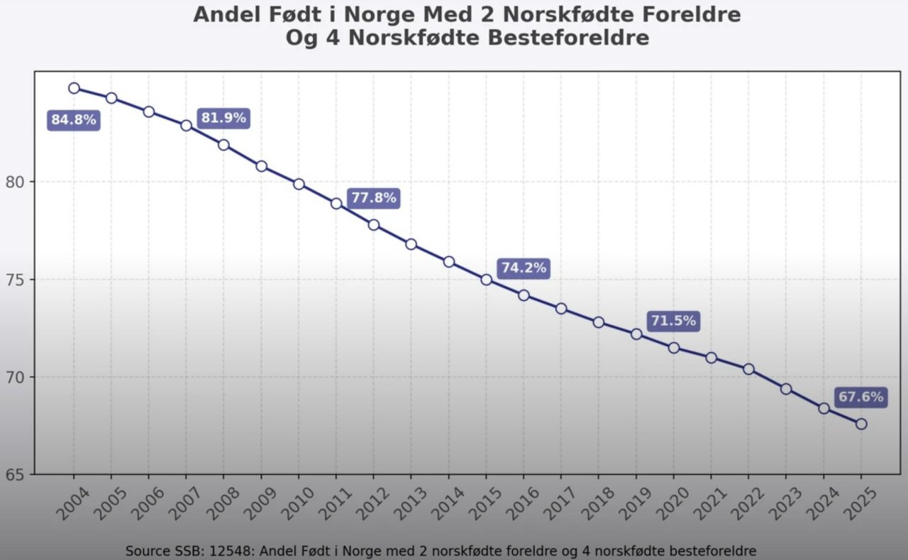 Befolkningsutskiftningen i Norge går i et rasende raskt tempo, verdens mest radikale masseinnvandringspolitikk. Vi har allerede passert tippepunktet hvor nordmenn blir en minoritet. Selv om vi hadde stoppet innvandringen i dag, ville det ikke vært nok. Men vi er ikke i nærheten av å stoppe den, innvandringen til Norge er ekstremt høy. Vi gir bort like mange statsborgerskap til utlendinger i måneden som Danmark gjør på et helt år. -