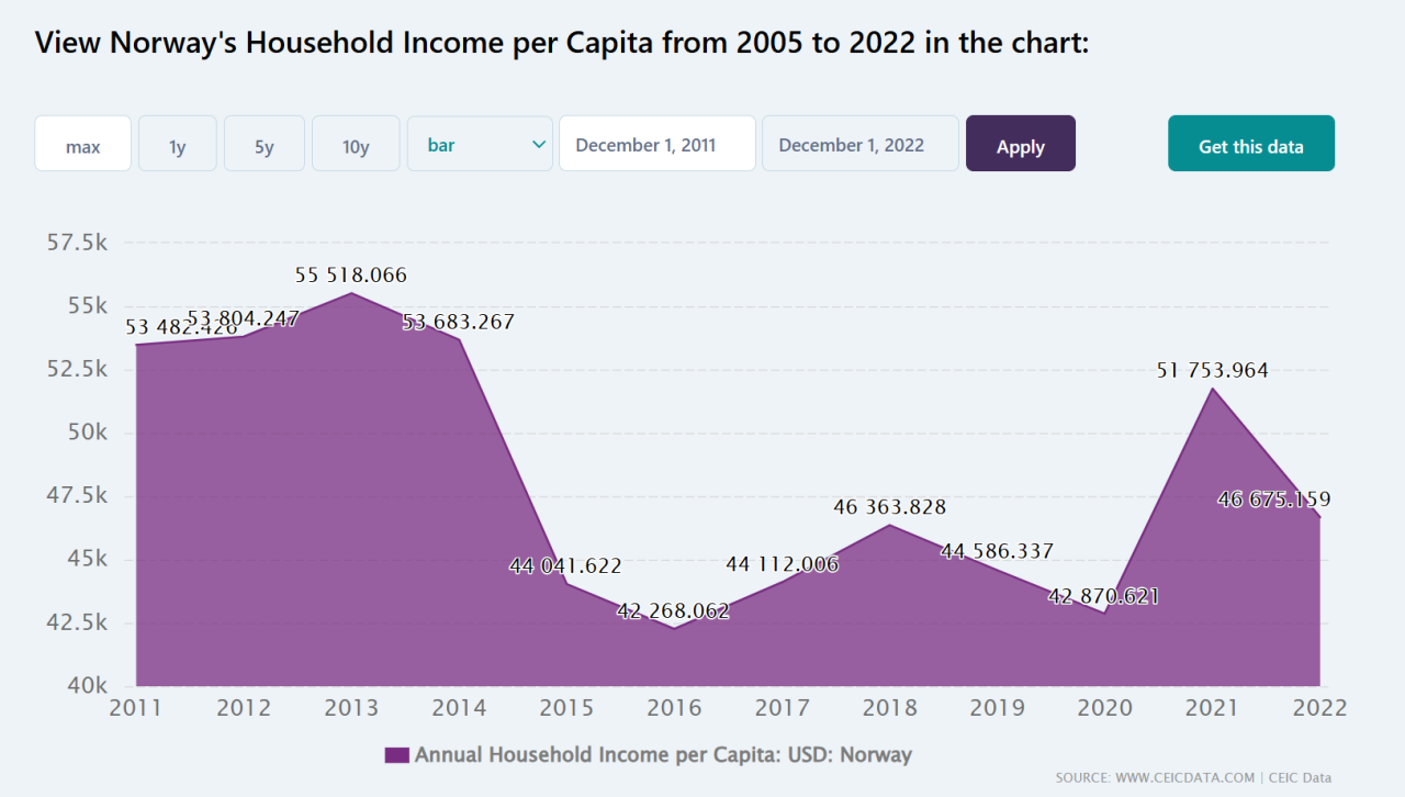Det er bare å sjekke tallene. En vanlig inntekt for en politimann i Sveits er på 1,2 mill nok i året, det samme gjelder alle yrker, lønningen er dobbelt så høy i Sveits. For 15 år siden så var inntektene i Norge på samme nivå. I Danmark, Nederland, Østerrike, Belgia så har man nå også høyere lønninger enn i Norge. For ikke å nevne Island, som på lik linje med Sveits har et betydelig høyere lønnsnivå Gjennomsnittsinntekt i Danmark etter skatt: 40000,- https://www.numbeo.com/cost-of-living/country_result.jsp?country=Denmark&displayCurrency=NOK I norge: 36800,- https://www.numbeo.com/cost-of-living/country_result.jsp?country=Norway https://www.aftenposten.no/norge/politikk/i/pQ7K3o/loennsoppgjoer https://www.aftenposten.no/meninger/debatt/i/wA44KP/13-aar-med-fallende-realinntekt-er-sjelden-kost Grafen viser norsk inntektsutvikling i usd