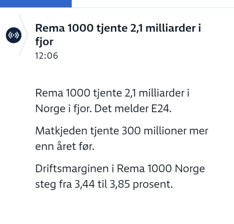 Denne er forøvrig interessant, det er ikke prisene inn til kjeden som har skylden denne gang, selv om tollmurene absolutt bidrar til høye priser der også https://www.nettavisen.no/okonomi/prisokninger-hos-kiwi-og-rema-de-har-et-forklaringsproblem/s/5-95-2328148