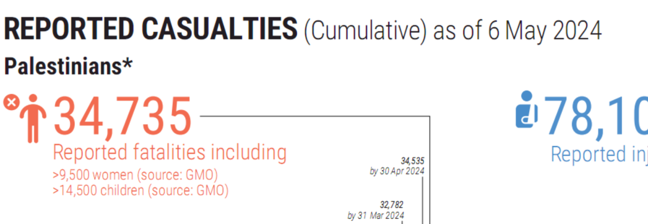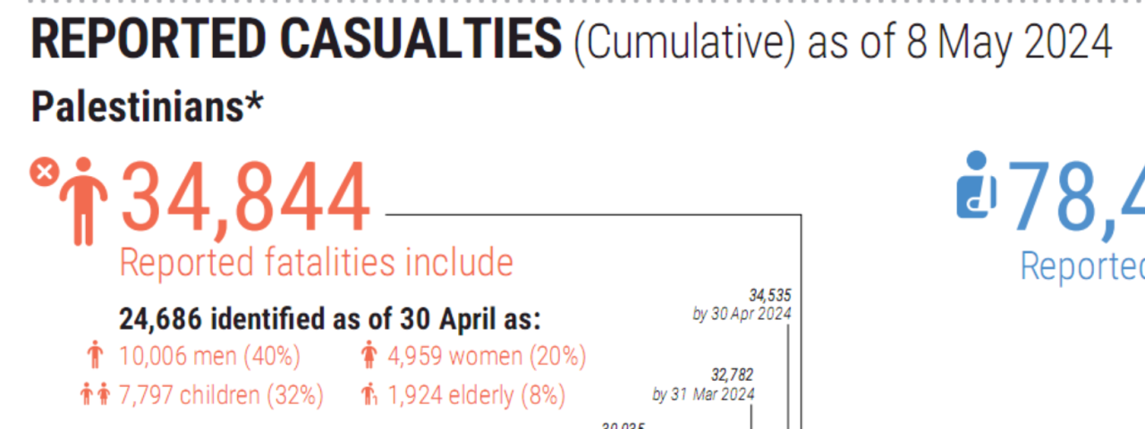 Forskjellen er at FN ikke lenger bruker GMO (Government run Media Office) som kilde men nå bruker MoH Gaza (Ministry of Health) som kilde. Med det samme er det ikke lenger snakk om "over 70 prosent av de døde er kvinner og barn". Men klart, det er bare en spiker, det med tall, ikke sant? Tall på antall drepte har ikke noe å si? Kilde: https://reliefweb.int/attachments/5f900ae9-6b25-495b-a88f-31f5772fca18/Gaza_casualties_info-graphic_6_May_2024.pdf Kilde: https://reliefweb.int/attachments/45cd7d21-b6d6-4f0b-8b04-bc13376500c5/Gaza_casualties_info-graphic_8_May_2024.pdf