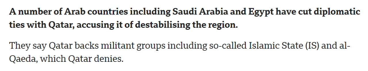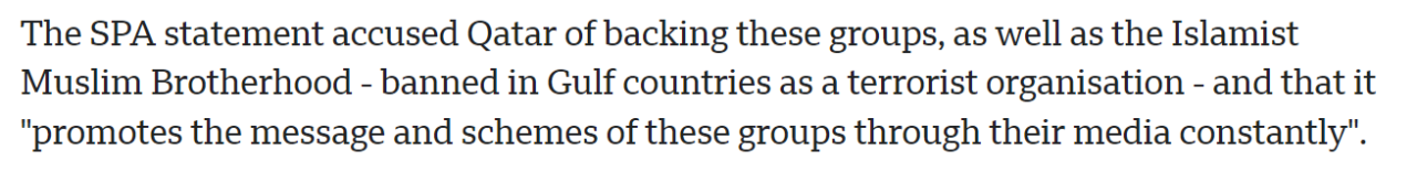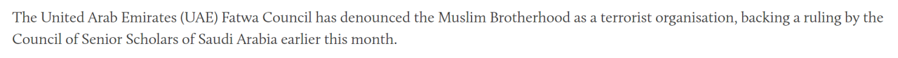 Det har med det "Muslimske Brødreskap" å gjøre. De oppfattes som en terrorgruppe i landene du nevnte. Med god grunn. ... https://www.middleeasteye.net/news/uae-muslim-brotherhood-fatwa-council-terrorist-organisation ... https://www.bbc.com/news/world-middle-east-26487092 ... https://www.bbc.com/news/world-middle-east-40155829 ... https://jcpa.org/egypt-fears-the-strengthening-of-the-muslim-brotherhood-movement/