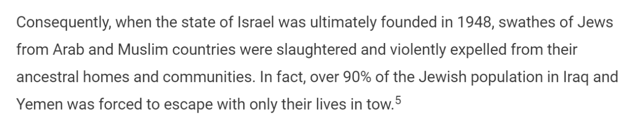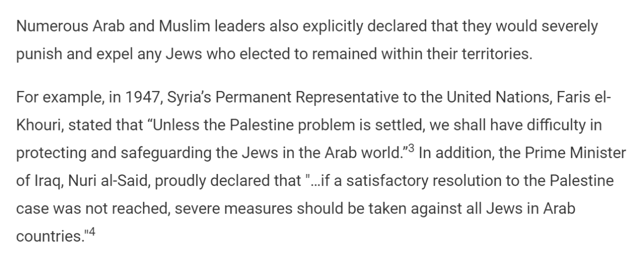 https://aish.com/jews-from-arab-lands-the-middle-easts-forgotten-refugees/ https://www.al-monitor.com/originals/2022/12/expulsion-jews-arab-countries-display-un-headquarters https://en.wikipedia.org/wiki/Day_to_Mark_the_Departure_and_Expulsion_of_Jews_from_the_Arab_Countries_and_Iran Overskriften til den britiske artikkelen er for øvrig misvisende (i beste fall). I videoen ber Kamala Harris om en seks ukers våpenhvile for å få ut gislene og få inn flere nødforsyninger til de sivile. Hun ønsker fortsatt at Hamas skal knuses. Israel har allerede gått med på en seks ukers våpenhvile, hvis de får en liste over de gjenværende gisler som fortsatt er i live. I tillegg må jo Hamas gå med på en våpenhvile, noe de ikke gjør.