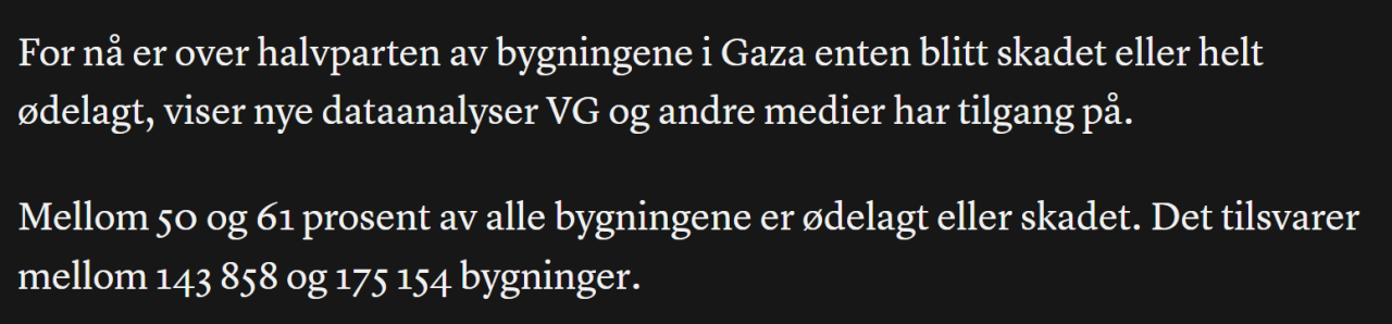 Det jeg skriver er at det er ikke så enorme ødeleggelser likevel. 70% av infrastrukturen er der fortsatt. Ja, høye tall, høye tall på grunn av at Hamas bruker skoler, boligblokker, sykehus, og annet som base. Det er ene og alene Hamas som er skyld i dette, ikke Israel. I følge fn.no så er 60%, ikke 30%, av alle bygninger enten ødelagt eller skadet. I følge de samme er det 290 000, ikke 69 000, bygninger som er skadet. https://fn.no/nyheter/gaza-krisen-de-siste-tallene-og-fns-respons Jevnfør disse tallene med UNOSAT sine tall: https://www.unitar.org/about/news-stories/press/new-satellite-imagery-analysis-reveals-30-gaza-strip-structures-damaged Og gjett hvem mediene siterer? https://www.vg.no/nyheter/utenriks/i/l3616k/nye-analyser-slik-oedelegges-gaza