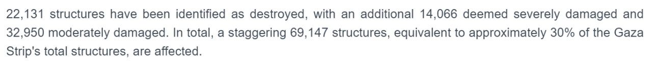 Rart. Vi får hele tiden høre at alt i Gaza er sønderbombet, at Israel har ødelagt så mye infrastruktur, at det bare er ruiner nesten overalt... https://www.unitar.org/about/news-stories/press/unosat-satellite-imagery-based-analysis-reveals-18-gaza-strip-structures-damaged-conflict-outburst