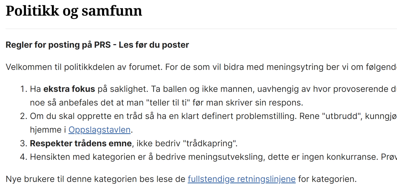 Når jeg går inn på Politikk og samfunn så står det øverst: Denne linken, "fullstendige retningslinjene": https://www.diskusjon.no/index.php?act=announce&id=37 ...går bare rett til forsiden av diskusjon.no, ikke til noen retningslinjer. Skal det være sånn? Uten retningslinjer blir det anarki. -