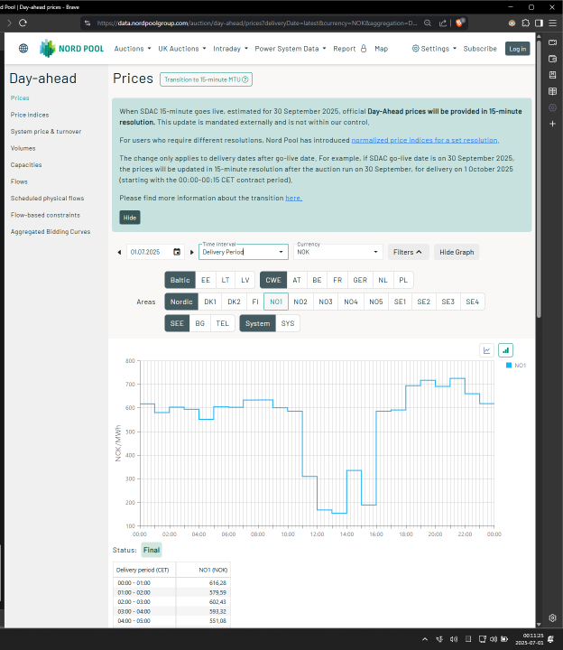 Jeg trenger litt hjelp til å sjekke spotpris i NO1. Hos Nord Pool fant jeg denne siden, er jeg på rett spor? https://data.nordpoolgroup.com/auction/day-ahead/prices?deliveryDate=latest¤cy=NOK&aggregation=DeliveryPeriod&deliveryAreas=NO1 eller https://tinyurl.com/nordpool-no1 Jeg ser at prisen (eksl. mva antar jeg) er NOK/MWh, og da er det vel bare å dele på 10 for å finne prisen i øre/kWh? Ellers flott at man kan endre tidsintervallet. -