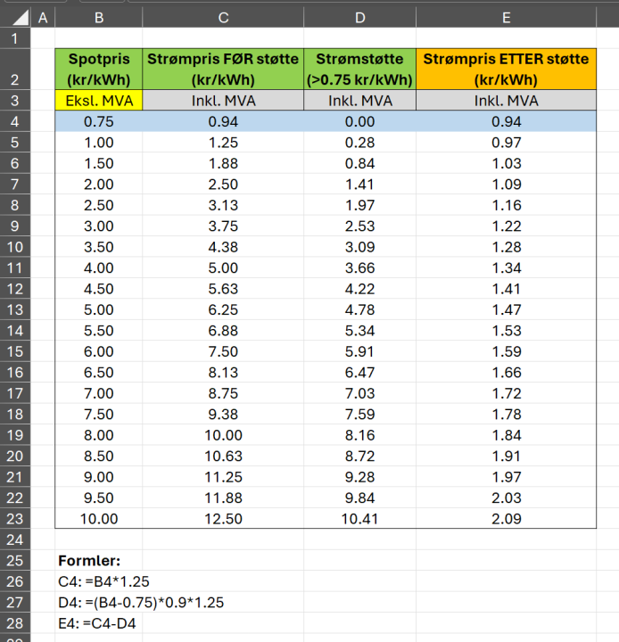 Prøver å regne ut hva strømprisen (inkl. mva), "Strømpris ETTER støtte (kr/kWh)", blir etter at strømstøtten er trukket fra. Er resulatet i Excel-arket korrekt? Edit: @Simen1, takk for nyttig tilbakemelding i ditt innlegg. Jeg har nå oppdatert kolonnetitlene. -