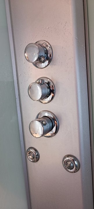 1. Hei! Siden vi kjøpte nytt hus for 1,5 år siden har vi ikke kunnet snu termostaten i dusjen (nederste "hjul" på bildet) mot høyre (kaldt) mer enn hva som er vist på bildet. Den stopper helt opp, og jeg er redd jeg knekker av termostaten hvis jeg skal påføre mer kraft. Termostaten kan derimot snus til venstre (varmt) så mye du vil. Noen som vet hva som forårsaker dette, eventuelt om hva som kan fikse dette uten hjelp av rørlegger? På forhånd takk!