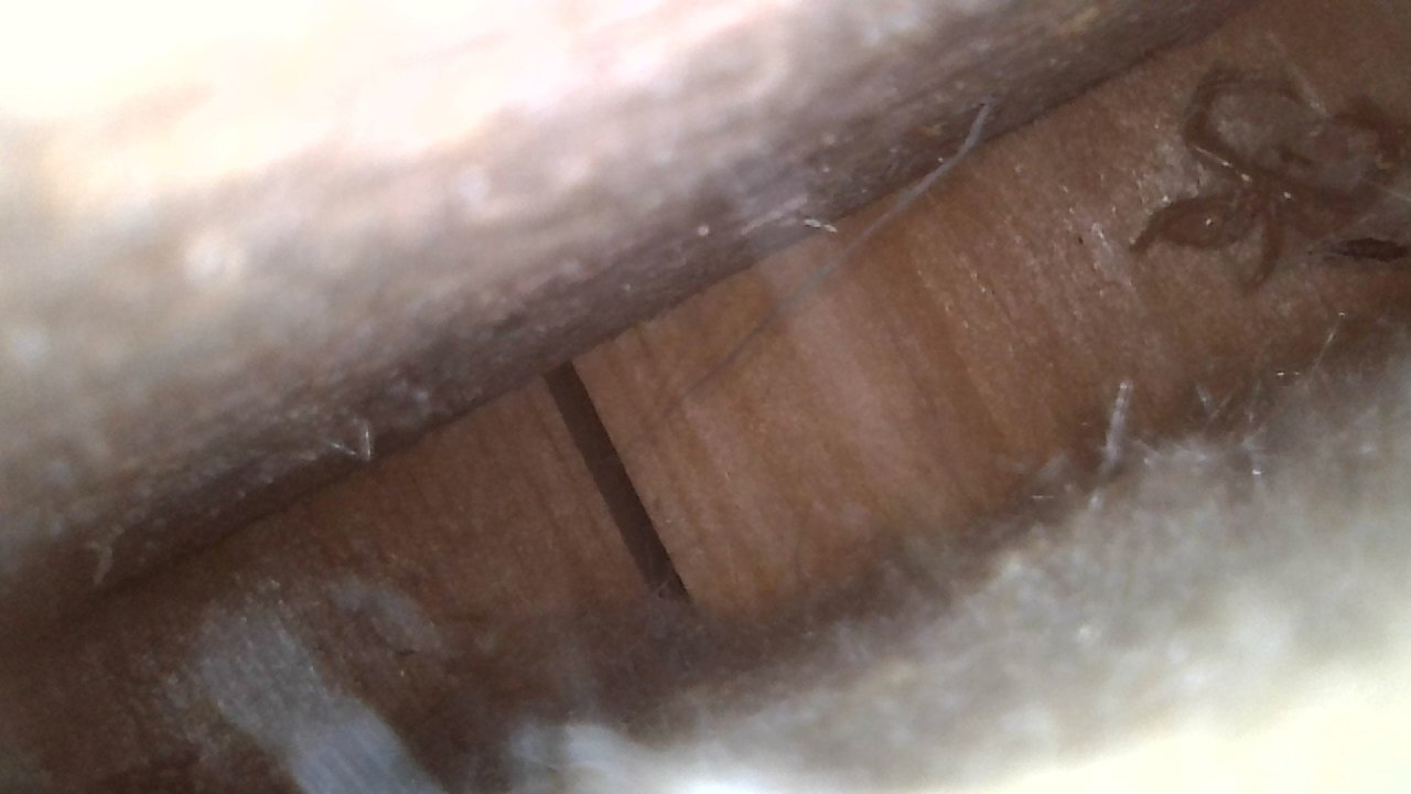 7. Jeg har anskaffet et inspeksjonskamera for rørinspeksjon og diverse annet. Kamerahode på 4 mm, i tuppen av en lang kabel. I går brukte jeg dette til sjekk inne i bjelkelaget / etasjeskillet mellom hovedetasjen og kjelleren. Jeg ble meget overrasket over noe som synes å være et stort insekt - i høyre billedkant. Med flere centimeters størrelse. Som kan ligne på skorpioner. Noen som har peiling på hva dette kan være? Se bildet.