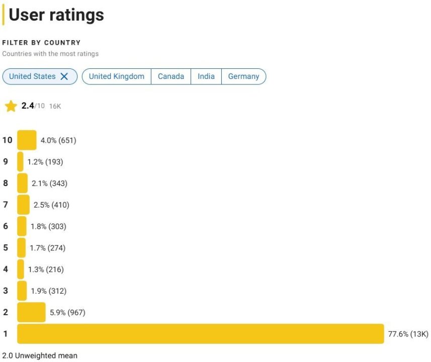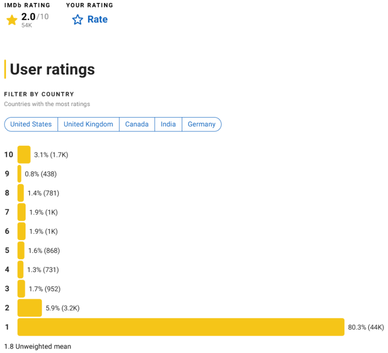 Ser vi globalt så er snittscore 2.0/10 @ 54K stemmer. 80,3% scorer filmen til 1/10. ⬇️ Sorterer vi derimot på KUN United States så er ikke scoren like dårlig lengre. Vi ser at 16k av 54k stemmer er fra USA. Totalscore derfra er 2,4/10 77,6% rater den 1/10 Blant de topp 5 landene som har gitt flest stemmer har USA gitt høyest snitt score og lavest andel 1/10 ratinger. Til sammenligning: India - 1,2/10 - 91% gir rating på 1 Tyskland - 1,7/10 - 81,9% gir rating på 1 🤓